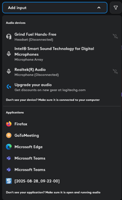 - Click on the input dropdown menu to choose the listening device you are using, for example, your headphones.