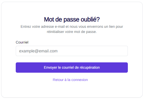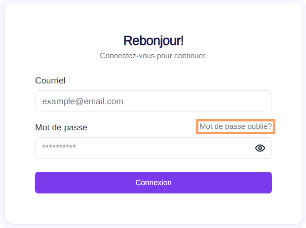 Le lien de réinitialisation du mot de passe se trouve sur la page de connexion. Vous pouvez aussi cliquer ici pour le changer.