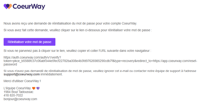 Vous allez recevoir un courriel à l'adresse que vous avez utilisée pour votre inscription. Voici un aperçu du courriel, veuillez cliquer sur Réinitialiser votre mot de passe.