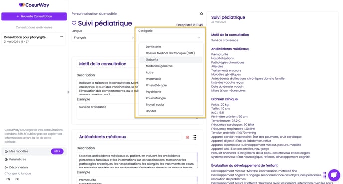CoeurWay dispose de plusieurs types de notes préétablis basés sur les modèles de différentes spécialités. Le Créateur de Modèles vous permet de personnaliser des gabarits de notes selon vos besoins.