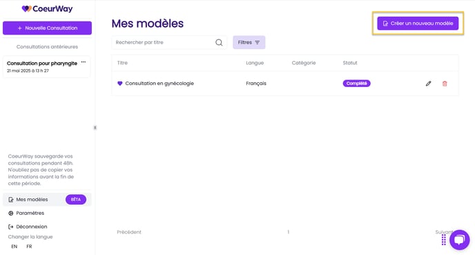 2. L’ensemble de vos modèles personnalisés s’affichent au centre de la page. Cliquez sur Créer un nouveau modèle.